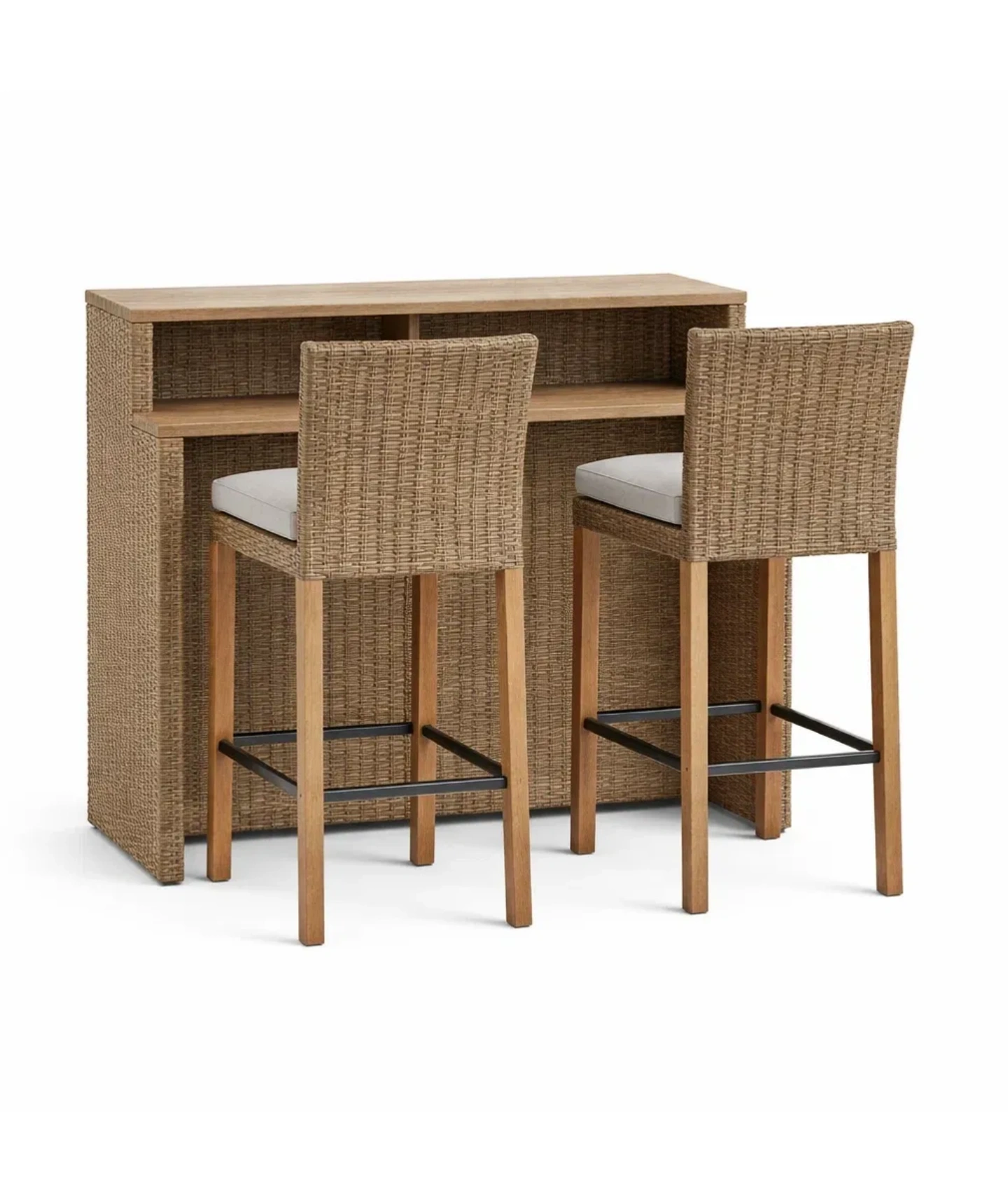 Ensemble de bar table haute carrée en chêne avec chaises en rotin et coussins gris